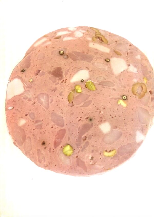 Měkký salám s mozaikou tvořenou pistáciemi, olivami, kousky špeku a libového masa.